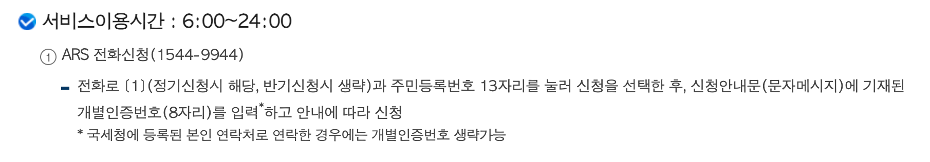 정확한 방법은 ARS로 통화 -> 1번 누르기(정기신청 시 해당) -> 주민등록번호 13자리 입력 -> 안내받은 개별인증번호 8자리를 입력 후 안내에 따라 신청하면 됩니다.