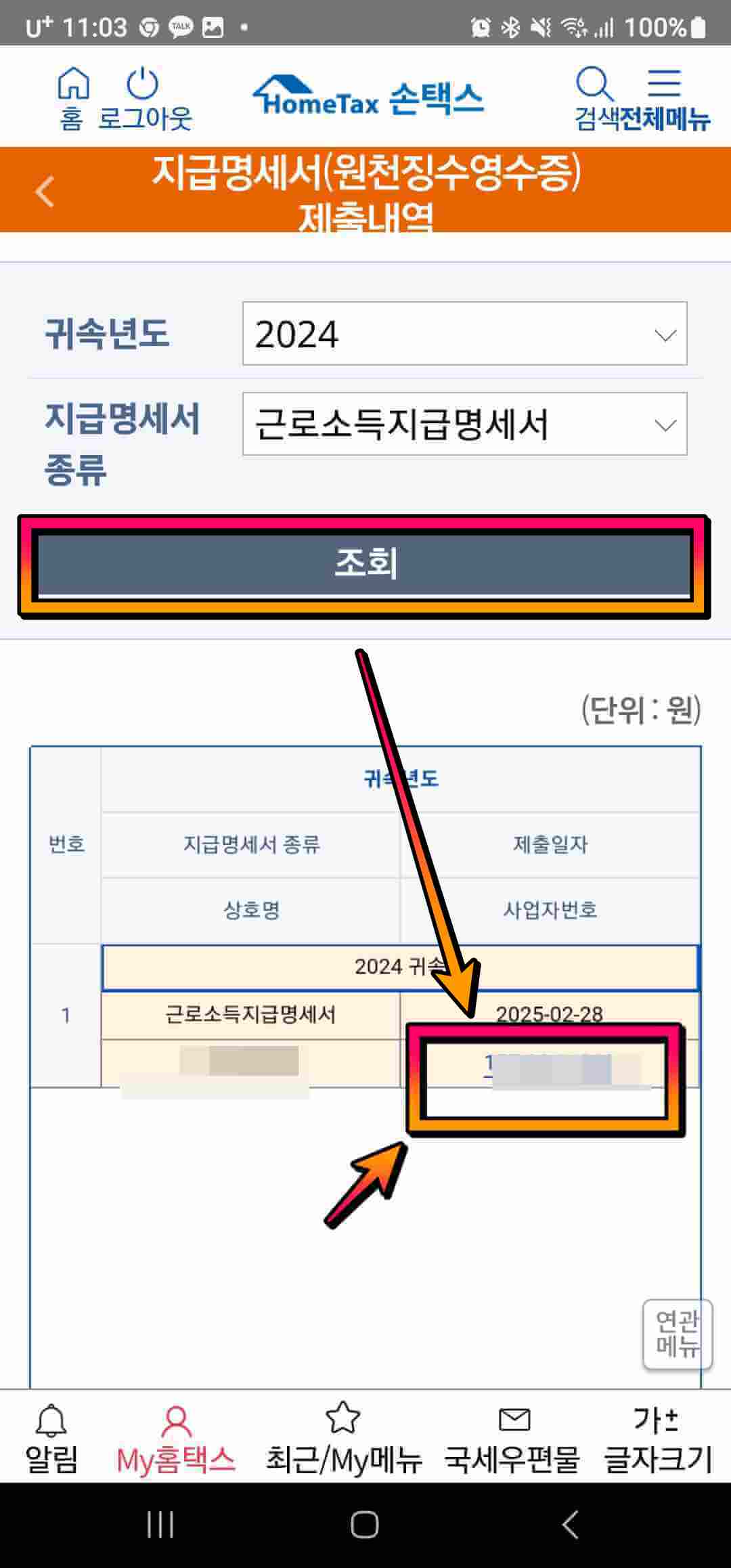 7. 근로소득 명세서 조회 클릭 후 파란 숫자 클릭
