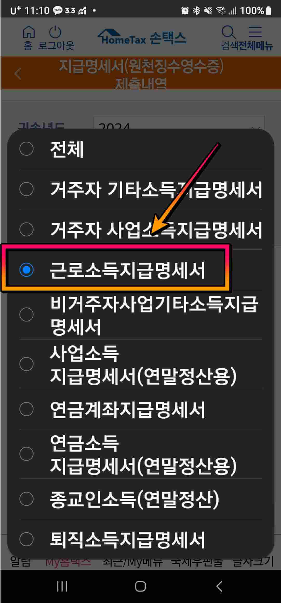 지급명세서 창에서 본인이 필요한 년도로 귀속 연도를 선택해 주시면 됩니다. 그리고 지급명세서 종류를 클릭하면 아래와 같은 창이 뜰 텐데요. 근로소득자라면 저처럼 근로소득지급명세서를 클릭해 주시면 됩니다