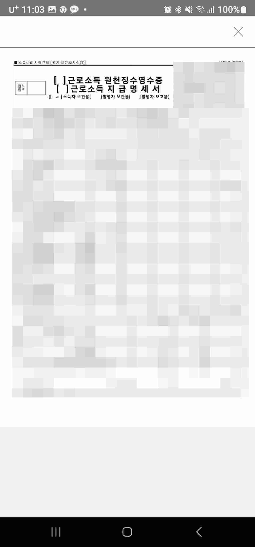 그러면 이제 원천징수영수증이 화면이 볼일 겁니다. 중요한 정보이니 저는 다 모자이크 처리해 놨습니다. 여기에서 본인의 해당 연도 소득을 정확히 보실 수 있습니다.