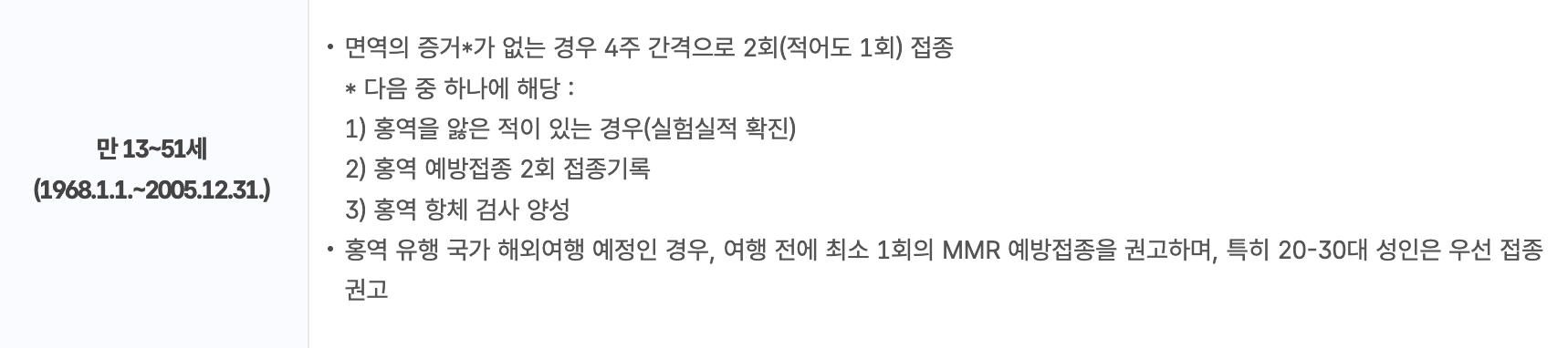 | 만 13~51세 | -면역의 증거가 없는 경우 4주 간격으로 2회적어도 1회) 접종 | 1~2회 접종 |